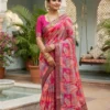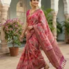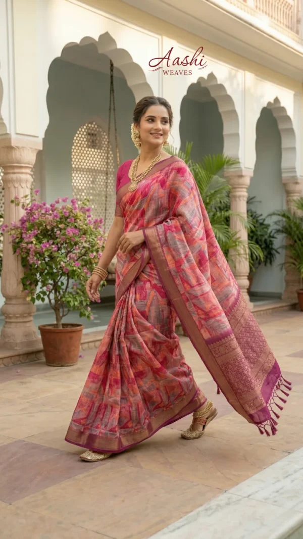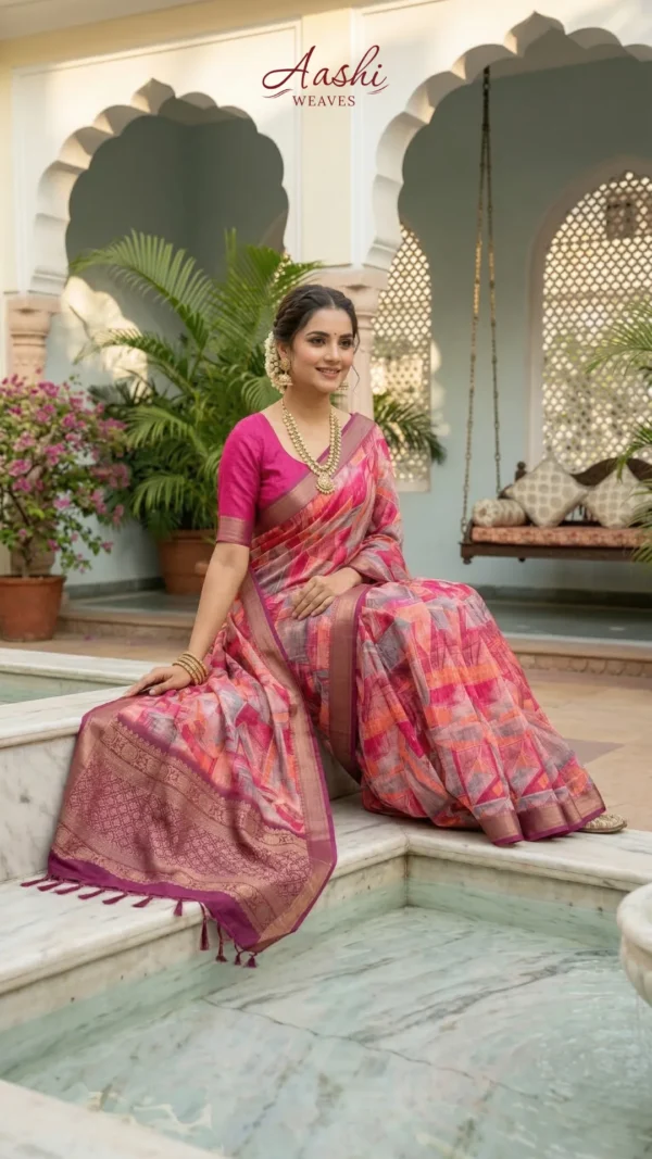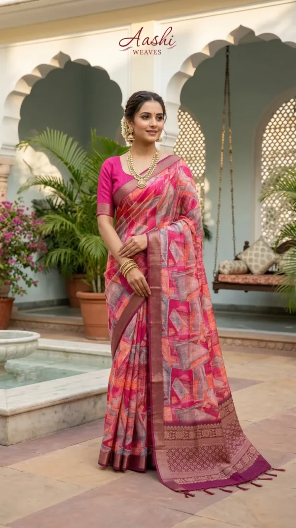 Step into the spotlight with this Bold Magenta Chanderi Silk saree, a perfect blend of artistic flair and ethnic heritage. The lightweight Chanderi fabric provides a signature translucent look and a subtle, luxurious sheen that catches the light beautifully. Unlike traditional florals, this saree features a striking contemporary abstract print in shades of pink, orange, and grey, creating a unique mosaic effect that is sure to turn heads.