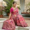 The saree is elegantly balanced with a refined copper-gold zari border and a heavily woven pallu that showcases traditional motifs, offering a stunning contrast to the modern body print. Complete with delicate hand-knotted tassels, this saree drapes effortlessly and feels weightless, making it an ideal choice for long evening events where you want to look high-fashion while staying comfortable.