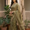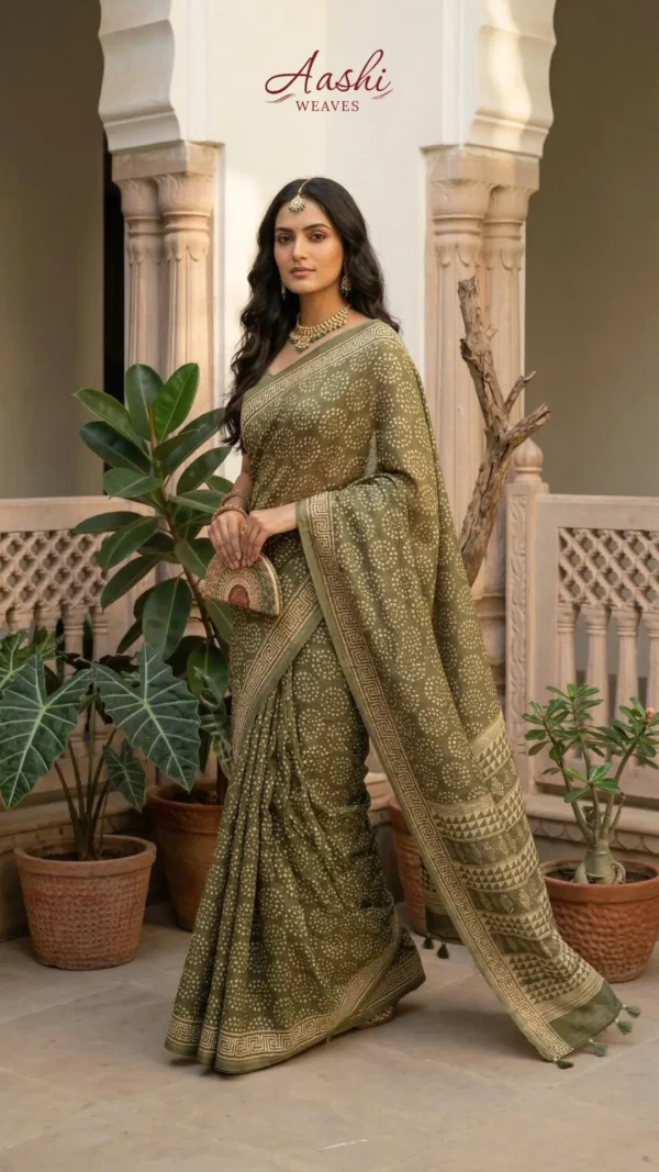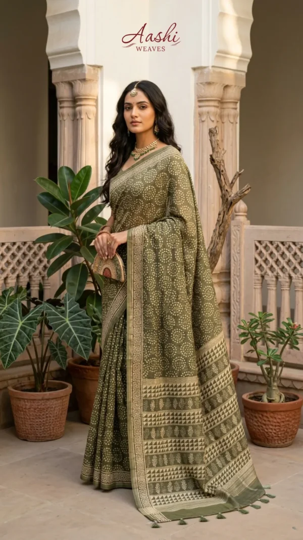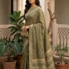Experience the timeless charm of the East with this exquisite saree crafted from premium Assam Silk. Known for its natural luster and durable texture, the fabric provides a structured yet graceful drape that flatters every silhouette. The deep olive green base is beautifully adorned with intricate cream block prints, drawing inspiration from traditional ethnic art, making it a masterpiece of understated elegance.