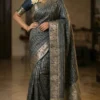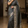 Step into timeless elegance with this luxurious steel blue Banarasi silk saree, beautifully adorned with intricate antique gold zari weaving. The rich geometric motifs combined with a grand traditional border give this saree a regal and sophisticated appeal. Its smooth texture and graceful drape make it a perfect choice for weddings, festive occasions, and traditional celebrations.