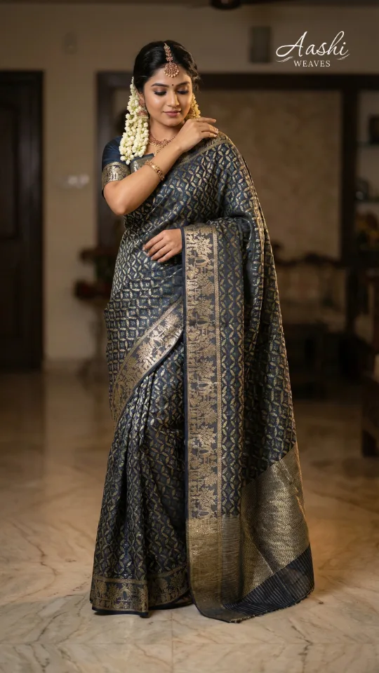 Midnight Steel Blue Banarasi Silk Saree with Antique Gold Zari Weaving