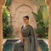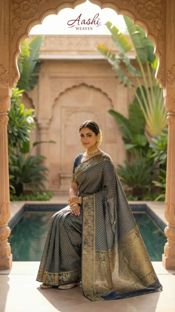 The highlight of this ensemble is the broad, ornate border and pallu, featuring meticulously woven traditional motifs that pay homage to classic Indian artistry. Its subtle translucency and rich metallic finish make it an ideal choice for grand occasions where you want to make a sophisticated statement. Pair it with traditional gold jewelry to complete a look that is steeped in grace and grandeur.