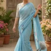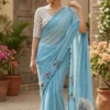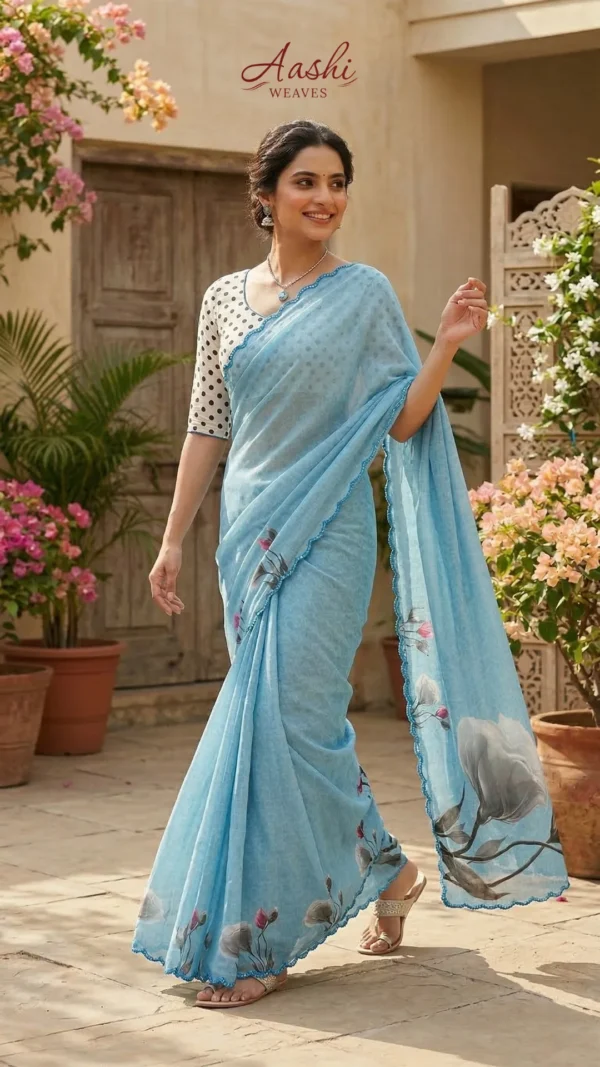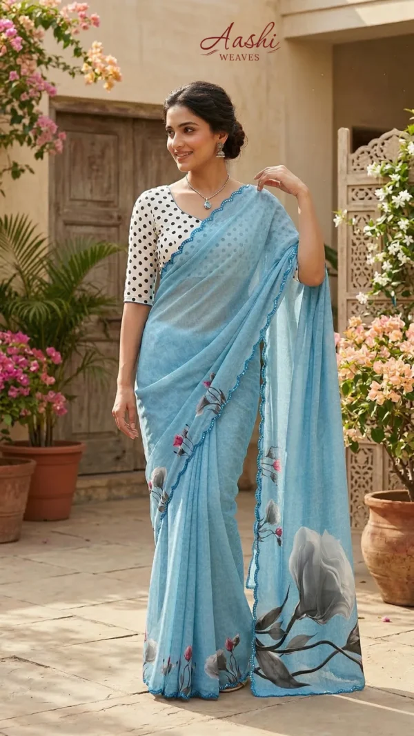 Crafted from lightweight georgette, this saree offers a perfect blend of grace and comfort with its soft, flowy drape. The soothing sky blue shade creates a calm and refreshing look, beautifully complemented by artistic floral prints that add a touch of natural elegance. The delicate scalloped lace border enhances its feminine charm, giving it a refined and stylish finish.