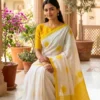 Crafted from breathable linen cotton, this saree is a perfect blend of comfort and playful elegance. The soothing off-white base is beautifully highlighted with cheerful yellow sun motifs, giving it a fresh and vibrant appeal. The subtle border and striped pallu add a modern touch, making it ideal for effortless everyday styling.