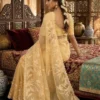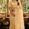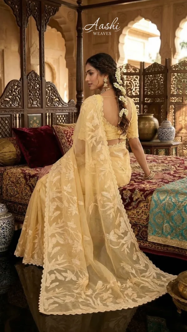 Crafted from pure organza, this saree radiates grace with its sheer texture and lightweight feel, offering a perfect balance of elegance and comfort. The soft yellow tone adds a subtle richness, while the finely detailed thread embroidery with delicate floral patterns enhances its sophisticated appeal.